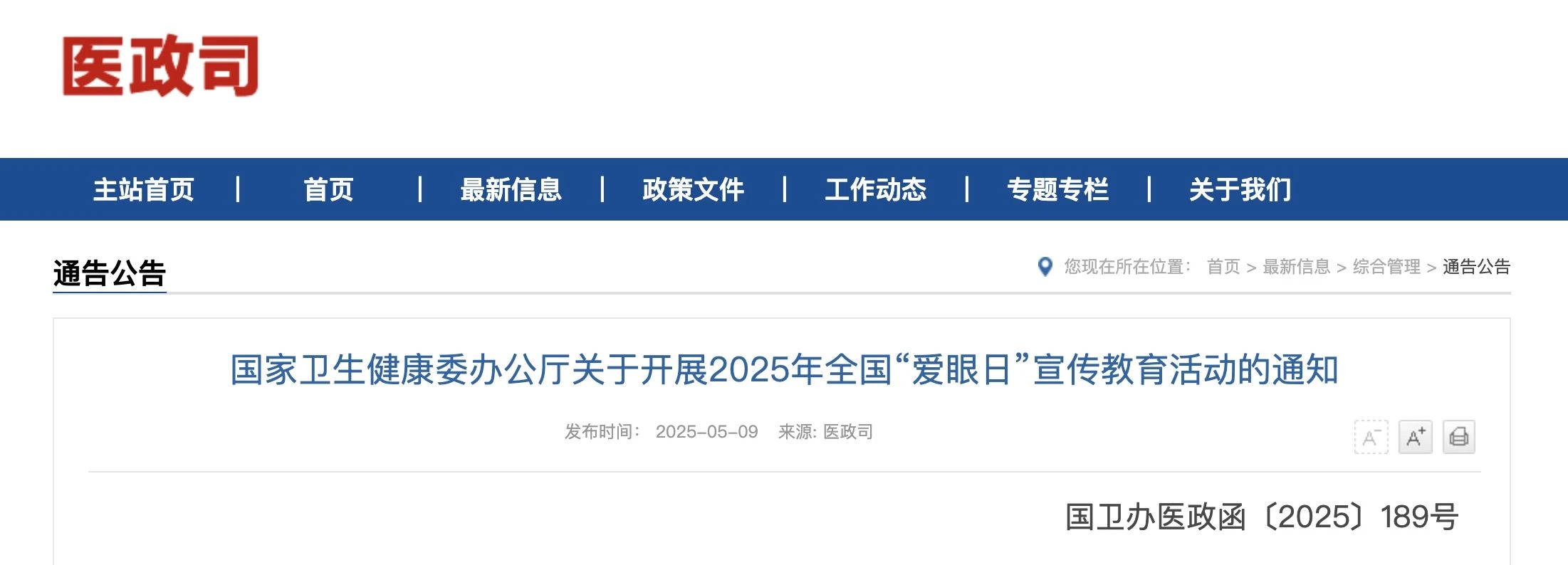 2025年6月6日是第30個全國“愛眼日”。為進(jìn)一步貫徹落實(shí)習(xí)近平總書記關(guān)于眼健康工作重要指示批示精神,充分調(diào)動社會各界積極性,提高人民群眾愛眼護(hù)眼意識,現(xiàn)就做好2025年全國“愛眼日”宣傳教育活動通知如下。聚焦近視等屈光不正、白內(nèi)障、眼底病、青光眼、角膜盲等重點(diǎn)眼病,重點(diǎn)關(guān)注兒童青少年、老年人兩大重點(diǎn)人群,大力宣傳全年齡段全生命周期眼健康的重要意義。參考宣傳口號如下:(二)科學(xué)防控近視,守護(hù)“睛”彩童年(五)科學(xué)護(hù)眼齊行動,全民共筑光明夢(六)“睛”彩人生從小呵護(hù),美好“視”界為老守護(hù)(一)開展系列宣傳活動。全方位發(fā)布全國“愛眼日”科普宣傳信息,營造愛眼護(hù)眼的良好社會氛圍。充分運(yùn)用多種宣傳教育形式,開展主題鮮明、形式多樣、內(nèi)容豐富的宣傳教育活動,提高全社會對眼健康知識的認(rèn)知和關(guān)注,確保宣傳效果和活動成效。我委醫(yī)政司將于5月中下旬,發(fā)布公益海報(bào)等宣傳材料,供各地使用。(二)組織眼科義診活動。組織轄區(qū)內(nèi)有條件的醫(yī)療機(jī)構(gòu)適時開展線上或線下義診活動,進(jìn)行眼科常見病的咨詢、篩查、問診和健康教育。各醫(yī)療機(jī)構(gòu)可結(jié)合自身互聯(lián)網(wǎng)醫(yī)療資質(zhì)情況開展線上義診活動,根據(jù)當(dāng)?shù)氐难劭萍膊√攸c(diǎn)進(jìn)行適宜眼病的咨詢與宣教。有條件的地區(qū)可以派出眼科專家及技術(shù)團(tuán)隊(duì)走進(jìn)基層、貼近群眾。鼓勵在眼病早期篩查中加強(qiáng)大數(shù)據(jù)、人工智能、5G等新興技術(shù)的應(yīng)用。(三)加強(qiáng)眼健康科普工作。組織醫(yī)療機(jī)構(gòu)結(jié)合當(dāng)?shù)匮劭萍膊√攸c(diǎn)及醫(yī)院專科特色,通過線上和線下的方式開展健康教育,面向社會公眾普及眼健康常識,培養(yǎng)正確就醫(yī)理念。積極推動愛眼宣傳進(jìn)社區(qū)、進(jìn)企業(yè)、進(jìn)學(xué)校、進(jìn)農(nóng)村、進(jìn)家庭等,注重提高兒童青少年、老年人等重點(diǎn)人群眼病防治意識。(一)將“愛眼日”宣傳教育活動作為深入貫徹落實(shí)習(xí)近平總書記重要指示批示精神的重要抓手,廣泛、深入、扎實(shí)開展各項(xiàng)工作。可結(jié)合兒童青少年近視防控等重點(diǎn)工作,調(diào)整、充實(shí)和完善活動形式和內(nèi)容,形成可操作、見實(shí)效的“愛眼日”活動方案并做好組織落實(shí)。可適時適度開展系列預(yù)熱活動。活動亮點(diǎn)可形成材料報(bào)我委醫(yī)政司。(二)積極統(tǒng)籌協(xié)調(diào)各方力量,形成政府積極主導(dǎo)、社會廣泛參與、人民共建共享的良好愛眼護(hù)眼宣傳局面。各地防盲技術(shù)指導(dǎo)組、各醫(yī)療機(jī)構(gòu)要針對重點(diǎn)人群和重點(diǎn)眼病,圍繞活動重點(diǎn)及口號,廣泛開展眼健康科普宣教,倡導(dǎo)眼病的早防、早篩、早診、早治。(三)承擔(dān)加強(qiáng)縣醫(yī)院白內(nèi)障手術(shù)能力建設(shè)工作任務(wù)的?。ㄗ灾螀^(qū)),可充分利用宣傳教育契機(jī),結(jié)合當(dāng)?shù)貙?shí)際,針對重點(diǎn)人群組織開展專項(xiàng)活動。做好相關(guān)政策宣傳和公眾科普,不斷提高各級醫(yī)院和縣域居民知曉率,引導(dǎo)當(dāng)?shù)厝罕娍茖W(xué)就醫(yī)。聯(lián)系人:醫(yī)政司??靳光明、李亞電?話:010-68792391、68791875