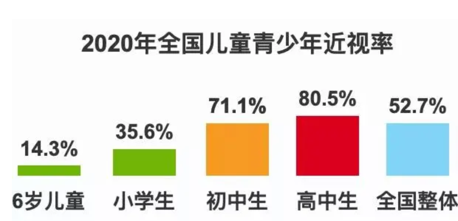 2018年,國家教育部、國家衛(wèi)健委等8部委聯(lián)合發(fā)布了《綜合防控兒童青少年近視實施方案》,明確指出到2023年力爭實現(xiàn)全國青少年總體近視率在2018年基礎(chǔ)上每年降低0.5個百分點以上,近視高發(fā)省份每年降低1個百分點以上。事實上直至2020年,我國兒童青少年總體近視率為52.7%,呈不降反增趨勢。總體而言,我國近視率呈不斷增長趨勢,同時呈地域化和高度化兩大特征: