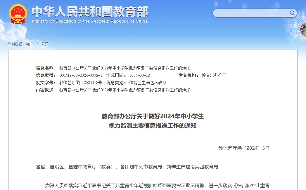 近期,教育部發(fā)布了《教育部辦公廳關(guān)于做好2024年中小學(xué)生視力監(jiān)測主要信息報(bào)送工作的通知》,強(qiáng)調(diào)要嚴(yán)格落實(shí)學(xué)生健康體檢制度和每學(xué)期兩次視力監(jiān)測制度,把近視防控關(guān)口前移,鼓勵(lì)有條件的地區(qū)和幼兒園開展3-6歲幼兒視力監(jiān)測,掌握幼兒視力情況。
